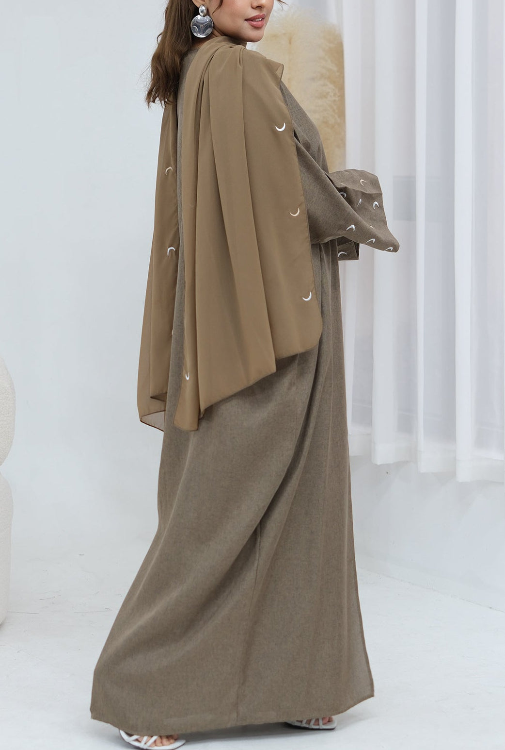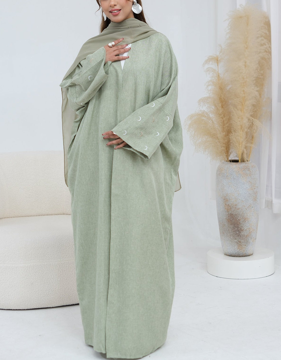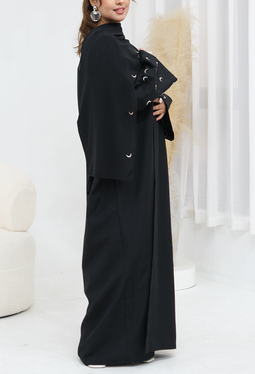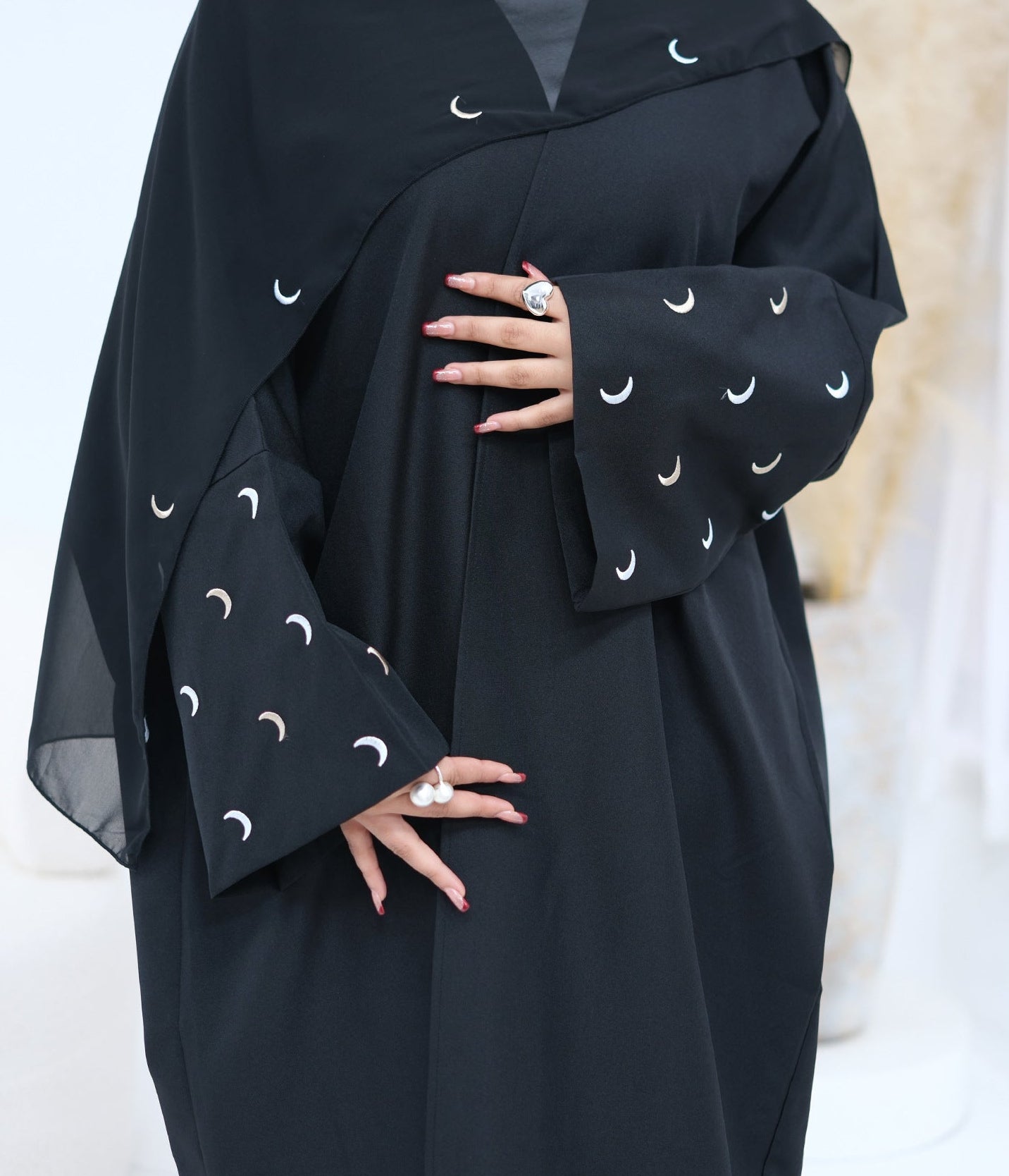 An abaya with beautiful moon embroidery, ideal for simple yet classy look while still prioritizing ease and comfort. A perfect addition to your Ramadan or daily wardrobe.