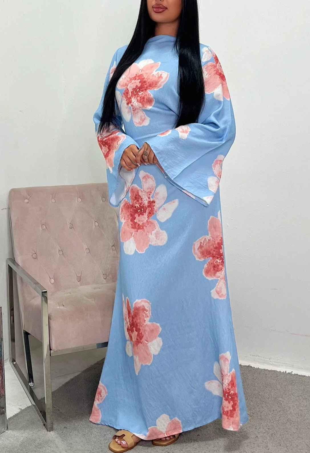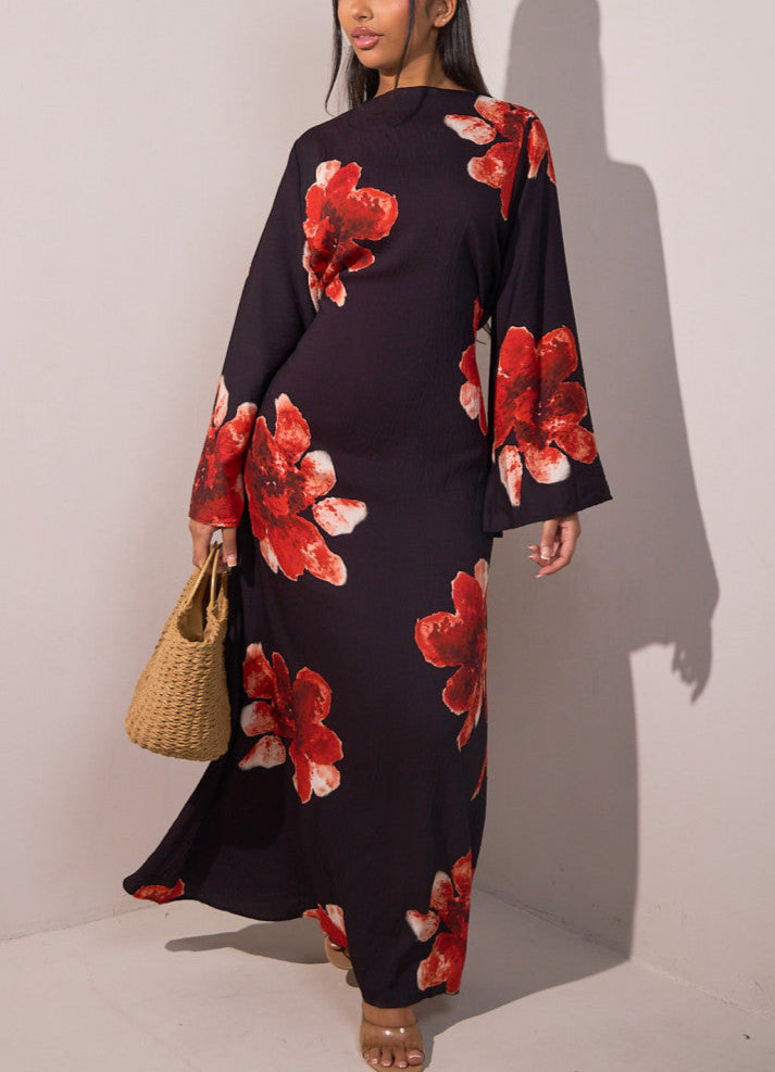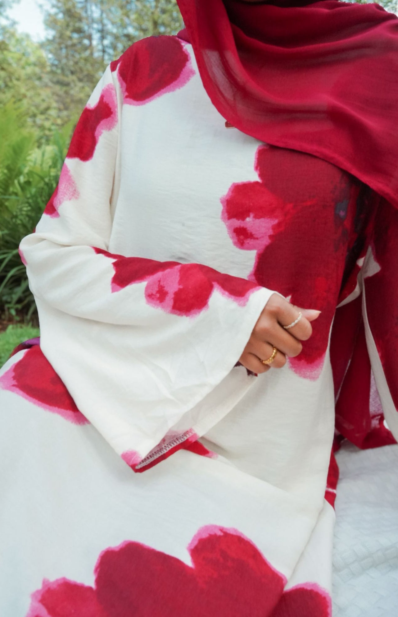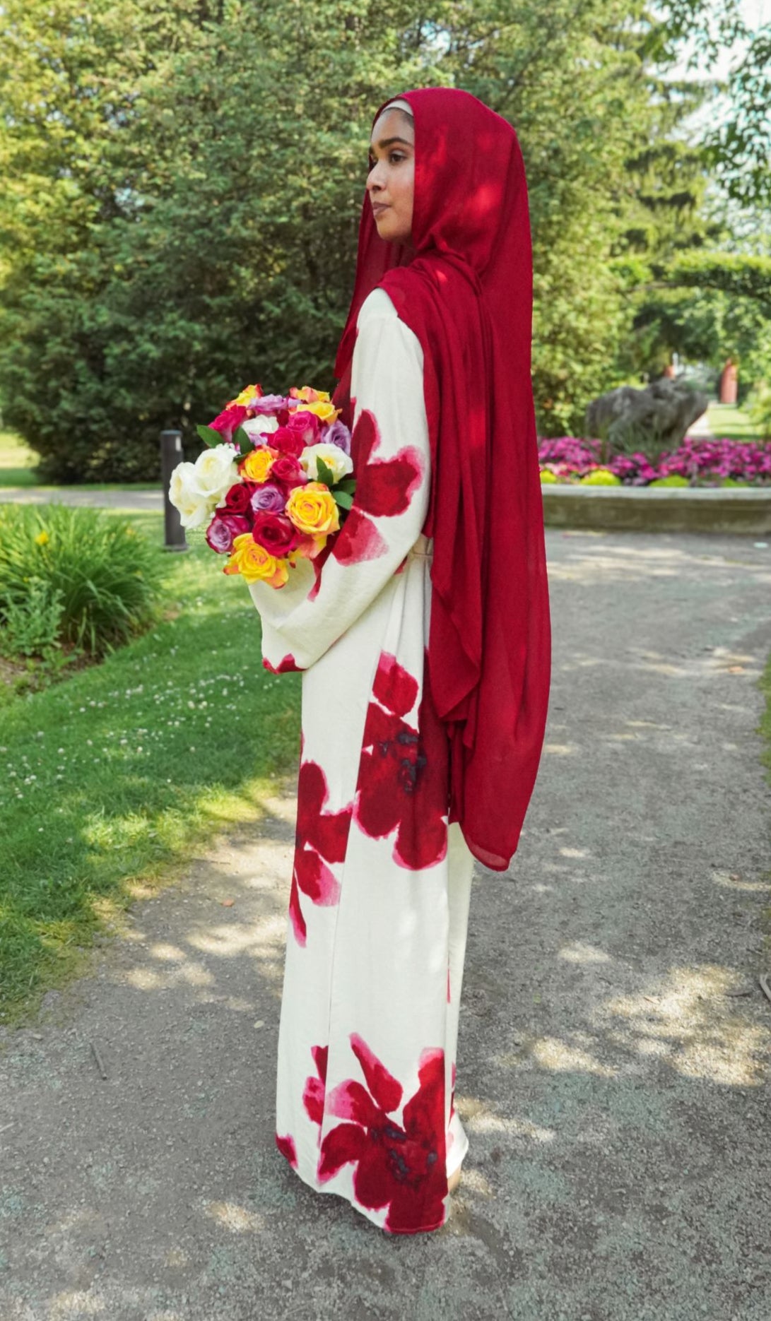 Graceful and modest maxi dress designed with a flattering flow and wide sleeves. The dress features a beautiful floral print and includes adjustable strings at the back to tie for a better fit. Made from lightweight, textured fabric that offers comfort and elegance for any occasion. Pair it up with our soft Modal Hijab to complete the look!