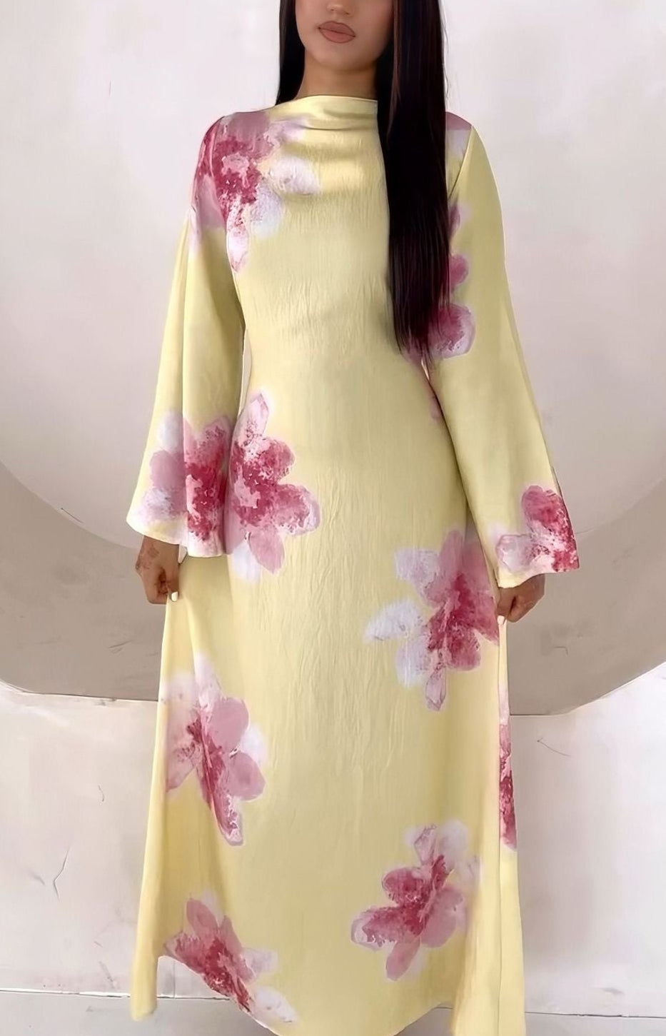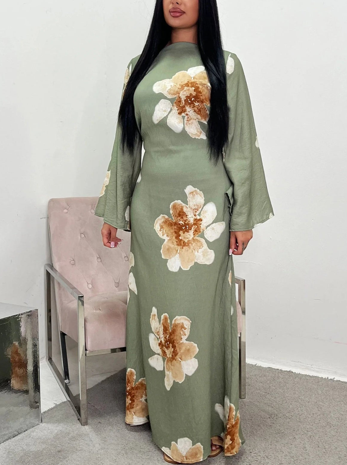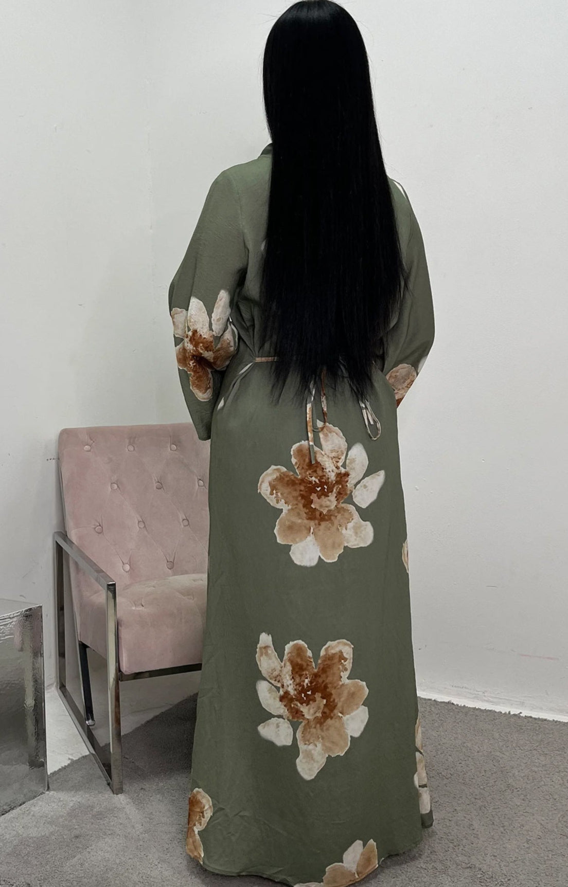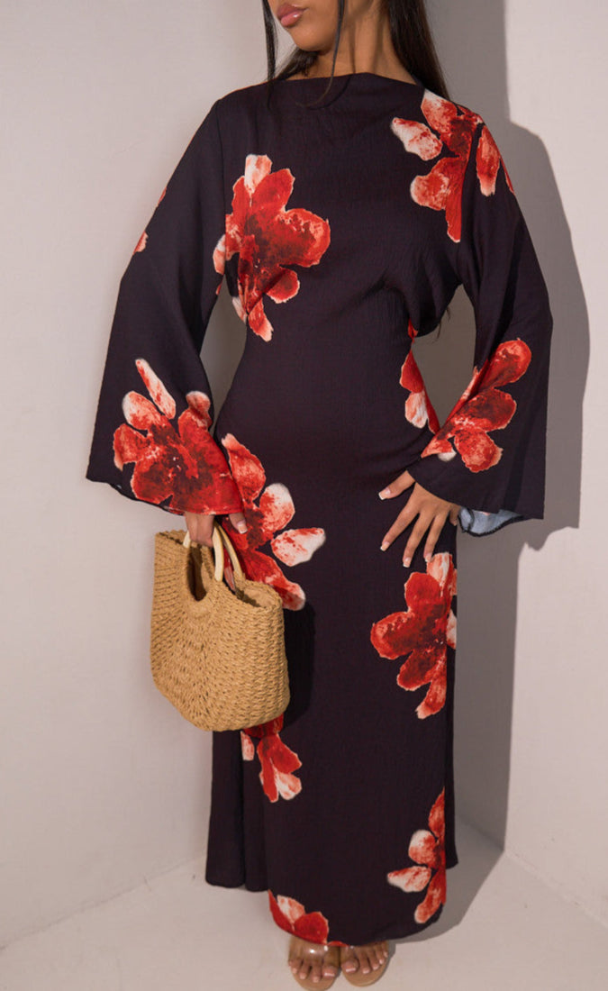 Graceful and modest maxi dress designed with a flattering flow and wide sleeves. The dress features a beautiful floral print and includes adjustable strings at the back to tie for a better fit. Made from lightweight, textured fabric that offers comfort and elegance for any occasion. Pair it up with our soft Modal Hijab to complete the look!