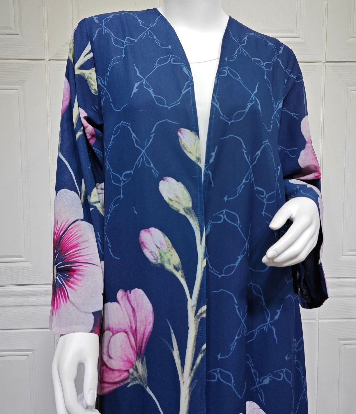 Step into effortless elegance with this stunning floral abaya set. Featuring a deep blue base adorned with oversized blush and soft pink blooms, this piece blends bold beauty with graceful sophistication.