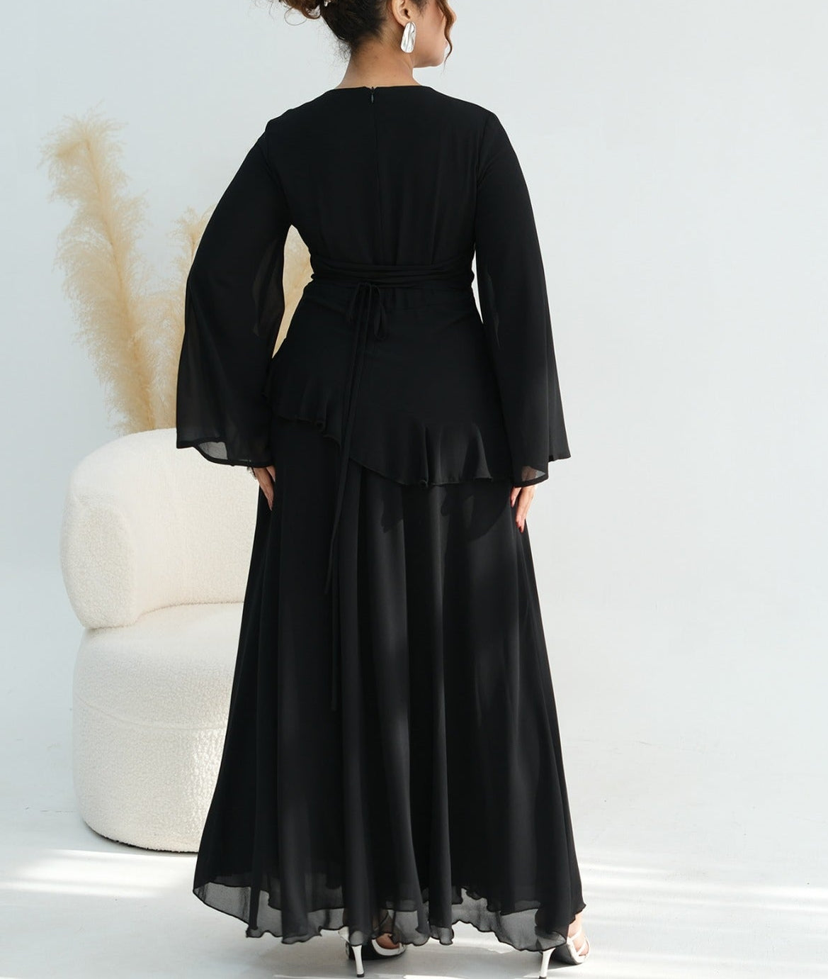 This full-length dress is designed with a timeless modest cut, featuring a gently contoured bodice that defines the waist before falling into a fluid, pleated skirt. The silhouette is enhanced with soft bell sleeves that create an airy, elegant movement with every step. A delicately layered peplum-style detail at the waist adds depth and visual interest, balancing structure with softness.