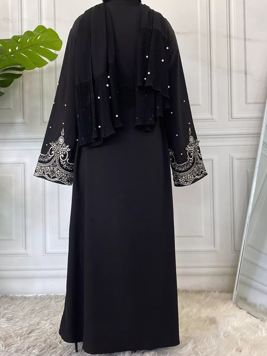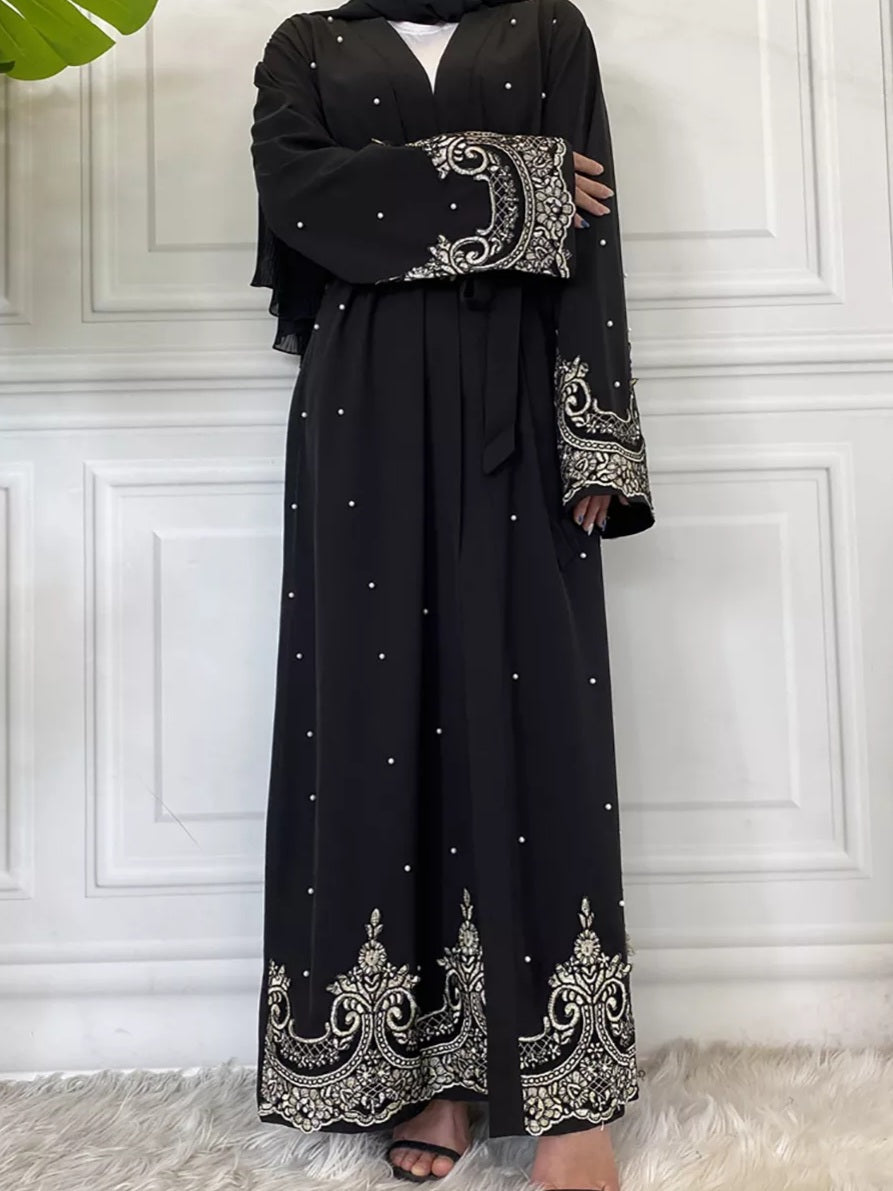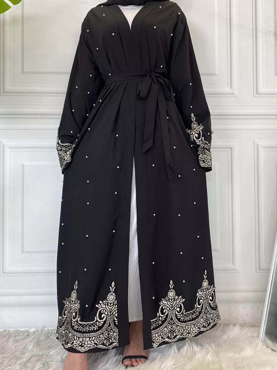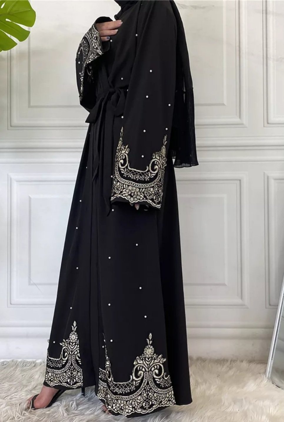 A luxurious Abaya with scattered pearls and a gorgeous silver lace finish. Perfect for formal events.