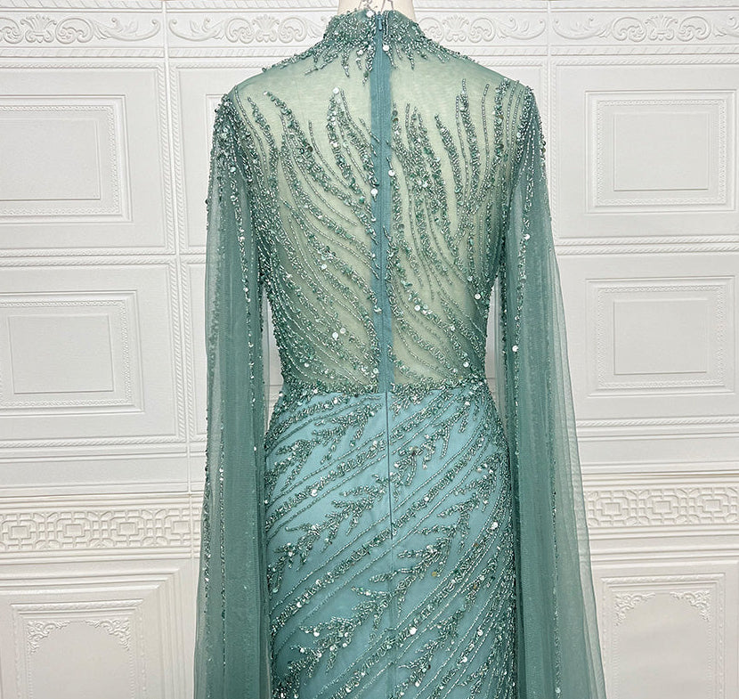 This gown exudes elegance and glamour, featuring intricate sequins and beads that create a dazzling effect. The cape-like sleeves flow gracefully, draping beautifully to enhance its sophisticated design.