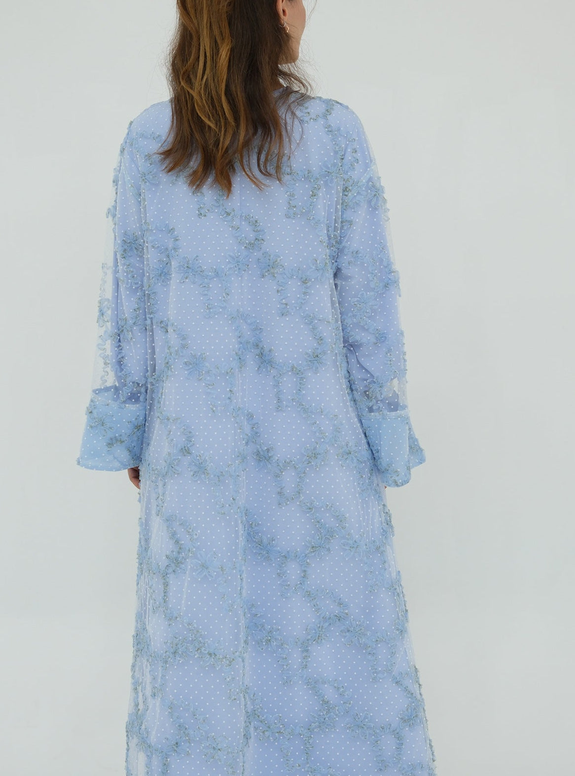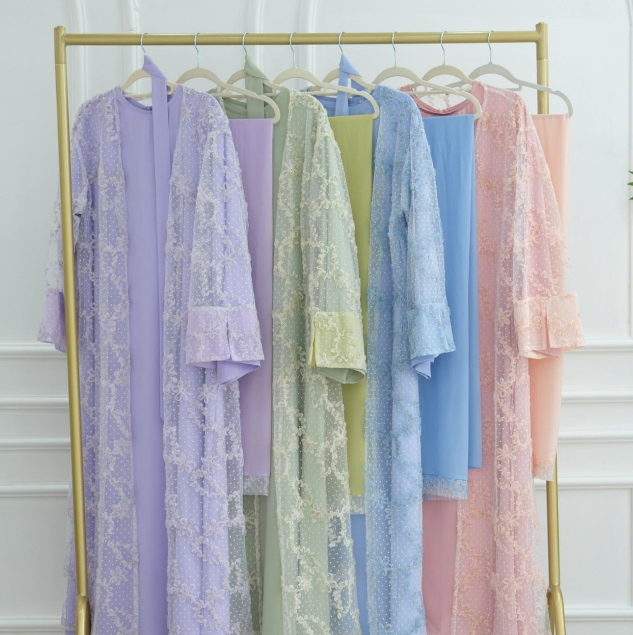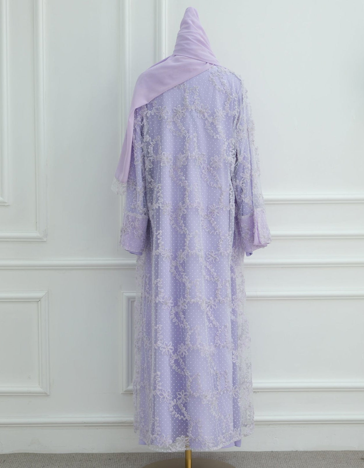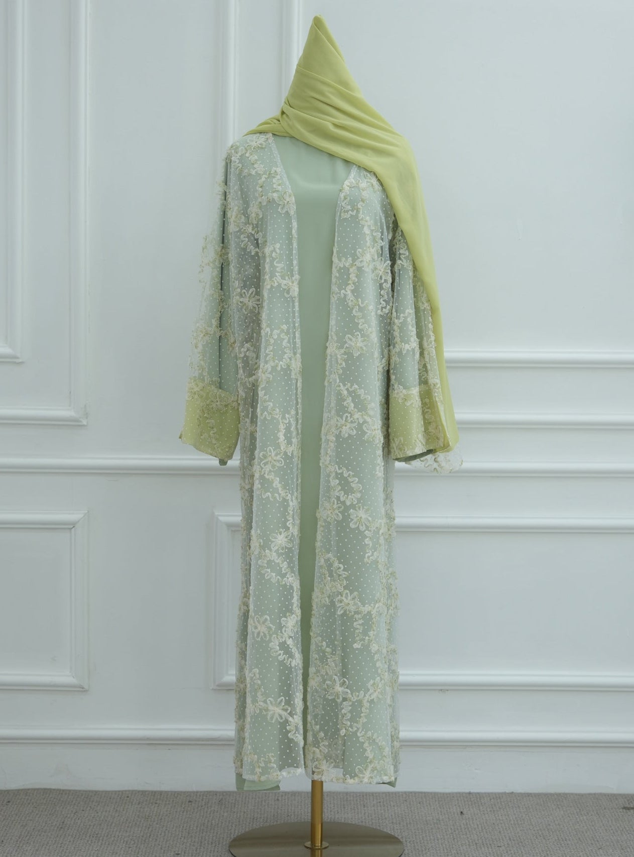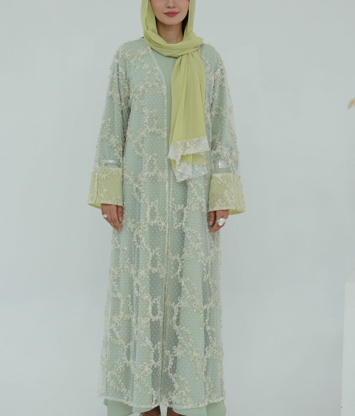 A timeless layered abaya designed with elegance in every detail. This piece features a soft inner dress paired with a delicate lace overlay cardigan, beautifully adorned with intricate floral embroidery and subtle textured detailing throughout. The flowy silhouette and flared sleeves add graceful movement, making it perfect for Eid or any formal occasion!