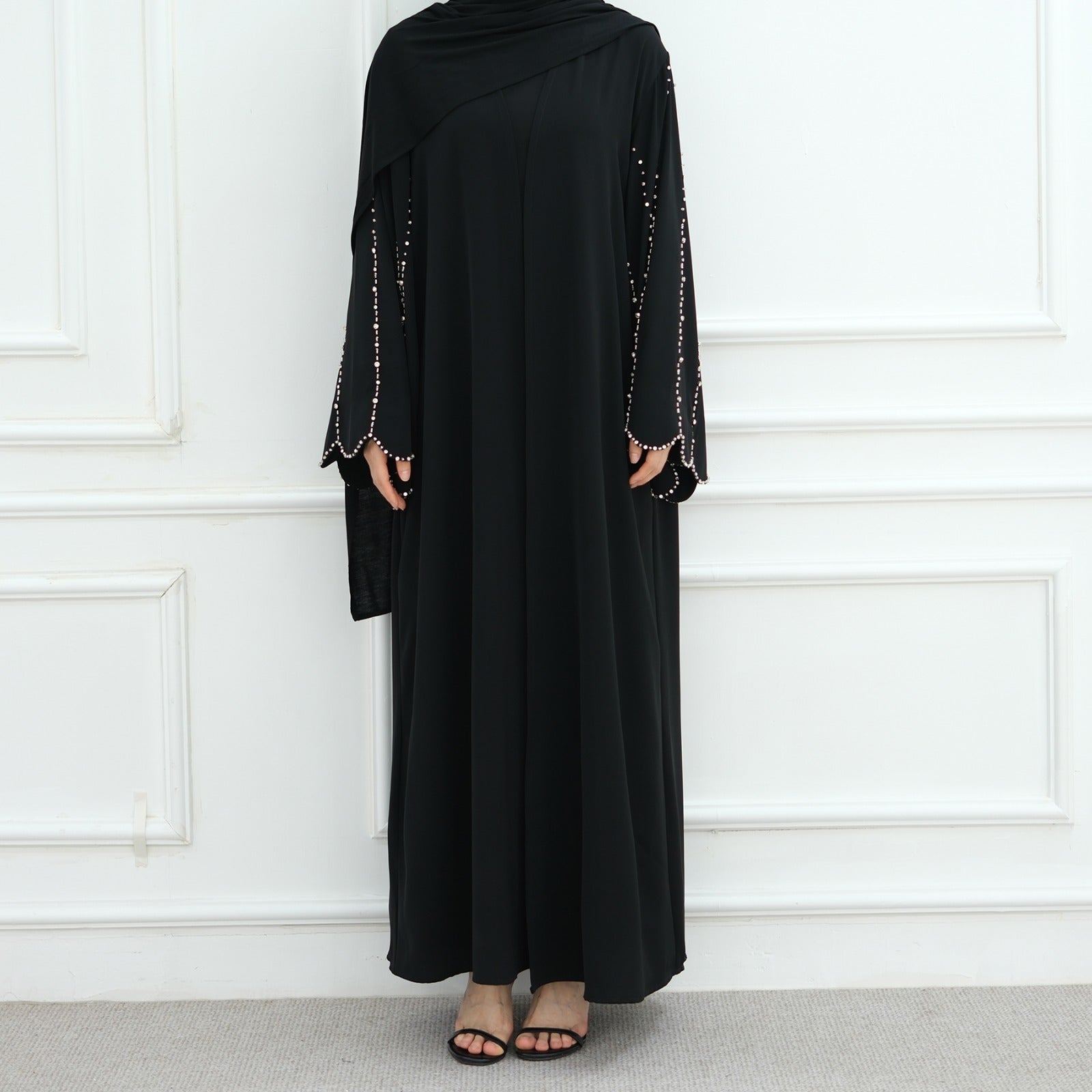 Elevate your modest wardrobe with this stunning open abaya set made with Nida material designed for both elegance and comfort. Featuring wide, flowy sleeves with intricate scalloped bead embellishments, this abaya offers a graceful and timeless look. The straight-cut design ensures a flattering fit, while the included sleeveless inner adds a touch of luxury and coverage.